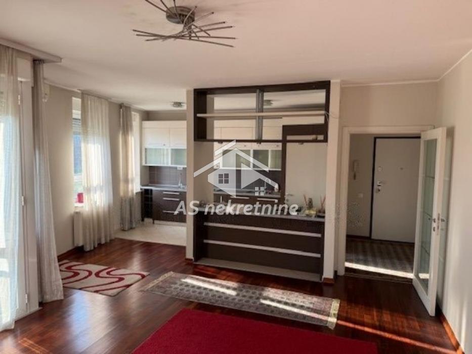 A one bedroom apartment of 68 m2 is available for rent in Block 19a, New Belgrade, within the Park Apartments complex. The apartment is located on the fourth floor of a five story modern building with an elevator, reception, and security.