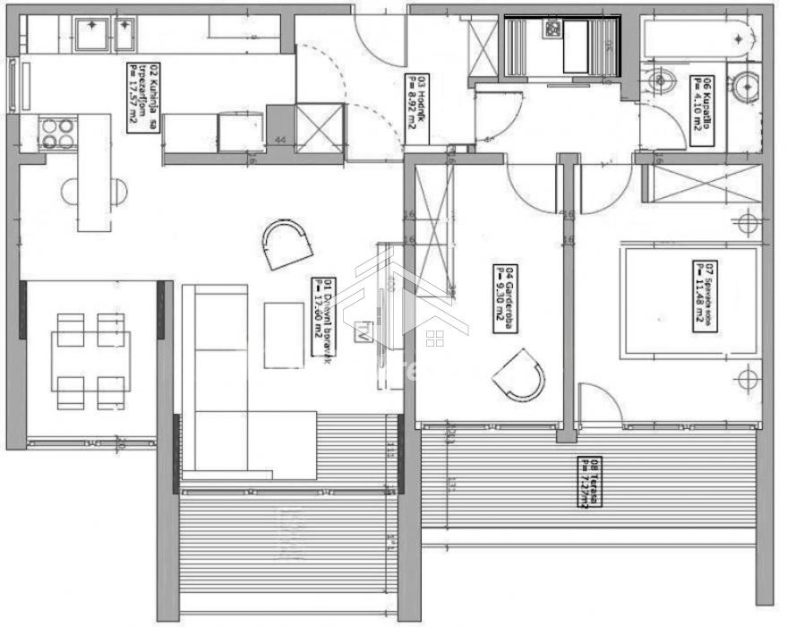 The apartment is east and south-oriented, featuring large windows that provide abundant natural light and a pleasant living atmosphere throughout the day. It consists of an entrance hall, kitchen, living room, dining area, bathroom, laundry/storage room, one bedroom, and an additional room currently arranged as a home office, which can easily be converted into a second bedroom, as well as two spacious terraces.
