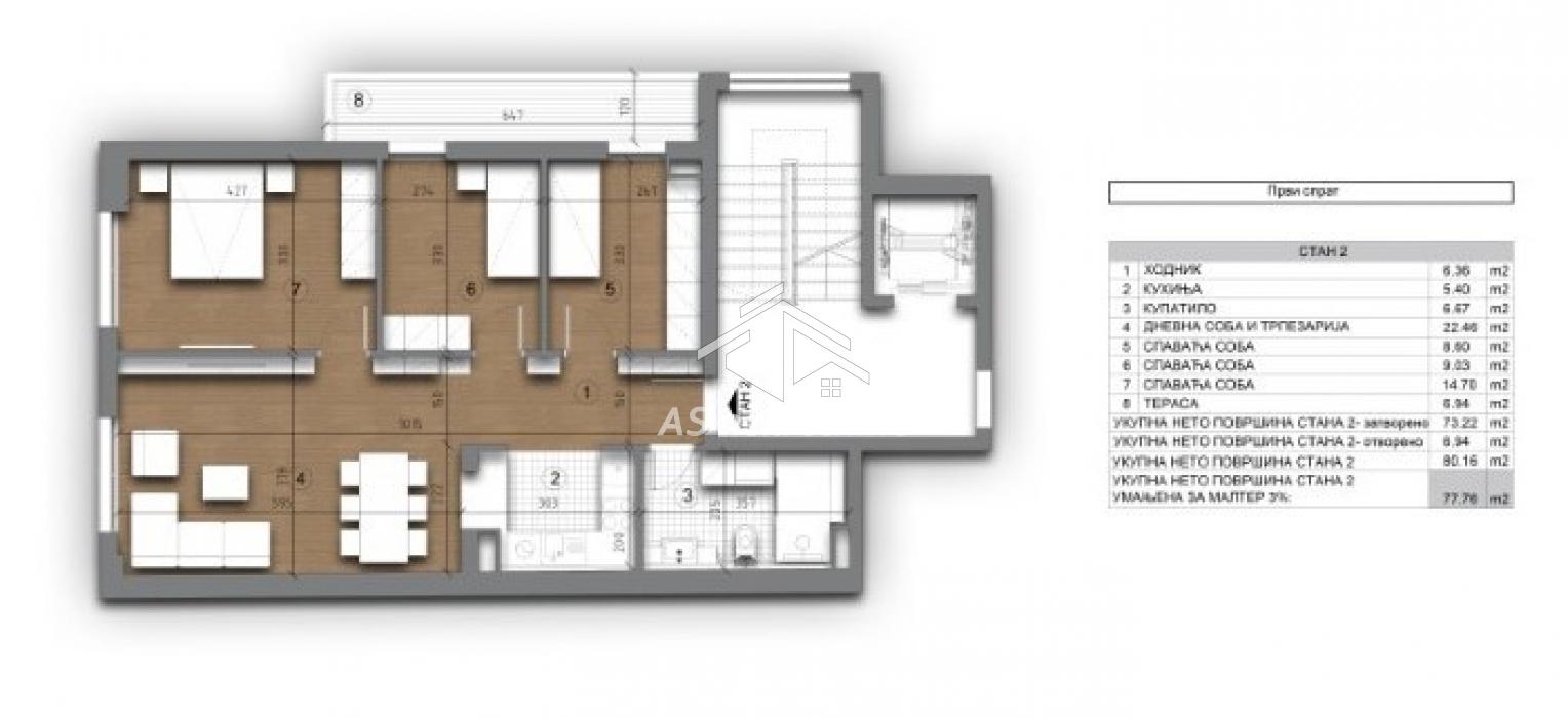 The layout is functional and tailored to family living. A bright living room with a dining area represents the central zone of the home. Three separate bedrooms allow a clear division of space for family members, guests or a home office. The organization of space maximizes every square meter, following a logical and modern living concept.